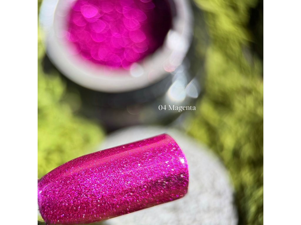 ENII Chromatic Pigment Magenta je profesionální práškový pigment s intenzivním chromovým a zrcadlovým efektem, který vytváří dokonale hladký a lesklý povrch bez viditelných částic. Díky extra jemné mikropráškové struktuře se pigment snadno zalešťuje, perfektně přilne k nehtu a umožňuje vytvářet efekty od jemného perleťového shimmeru až po výrazný mirror chrome design.