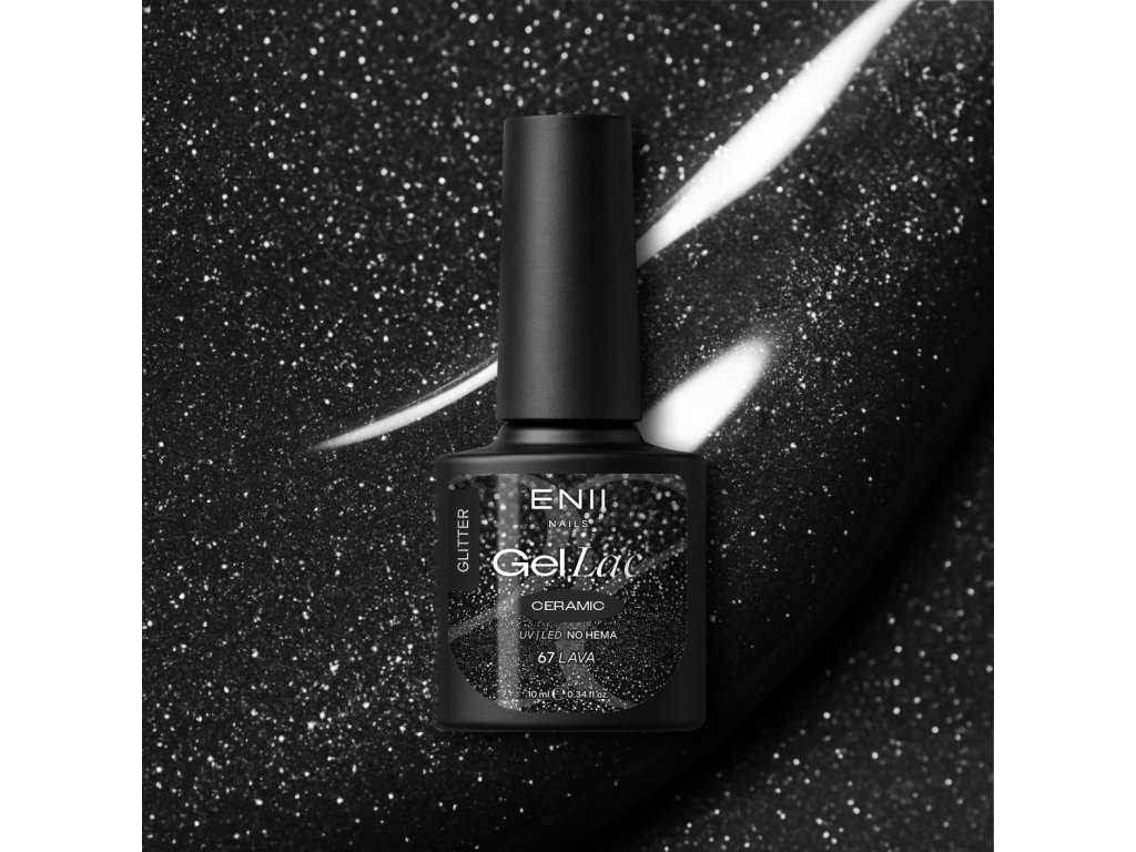 Profesionální gel lak č.67 černý se stříbrnými třpytkami, v krémové viskozitě, s vysokým leskem a vysokou durabilitou v 22FREE netoxicitě, minerály a NO HEMA