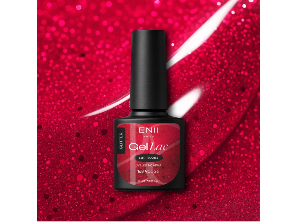 Profesionální gel lak č. 168 je zářivě červené barvy s glitry v krémové viskozitě, s vysokým leskem a vysokou durabilitou v 22FREE netoxicitě, minerály a NO HEMA