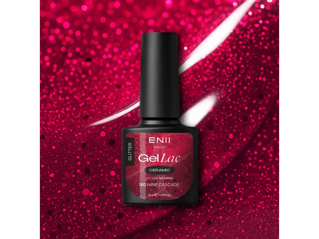 Profesionální gel lak č. 180 je vínově červené barvy s glitry v krémové viskozitě, s vysokým leskem a vysokou durabilitou v 22FREE netoxicitě, minerály a NO HEMA